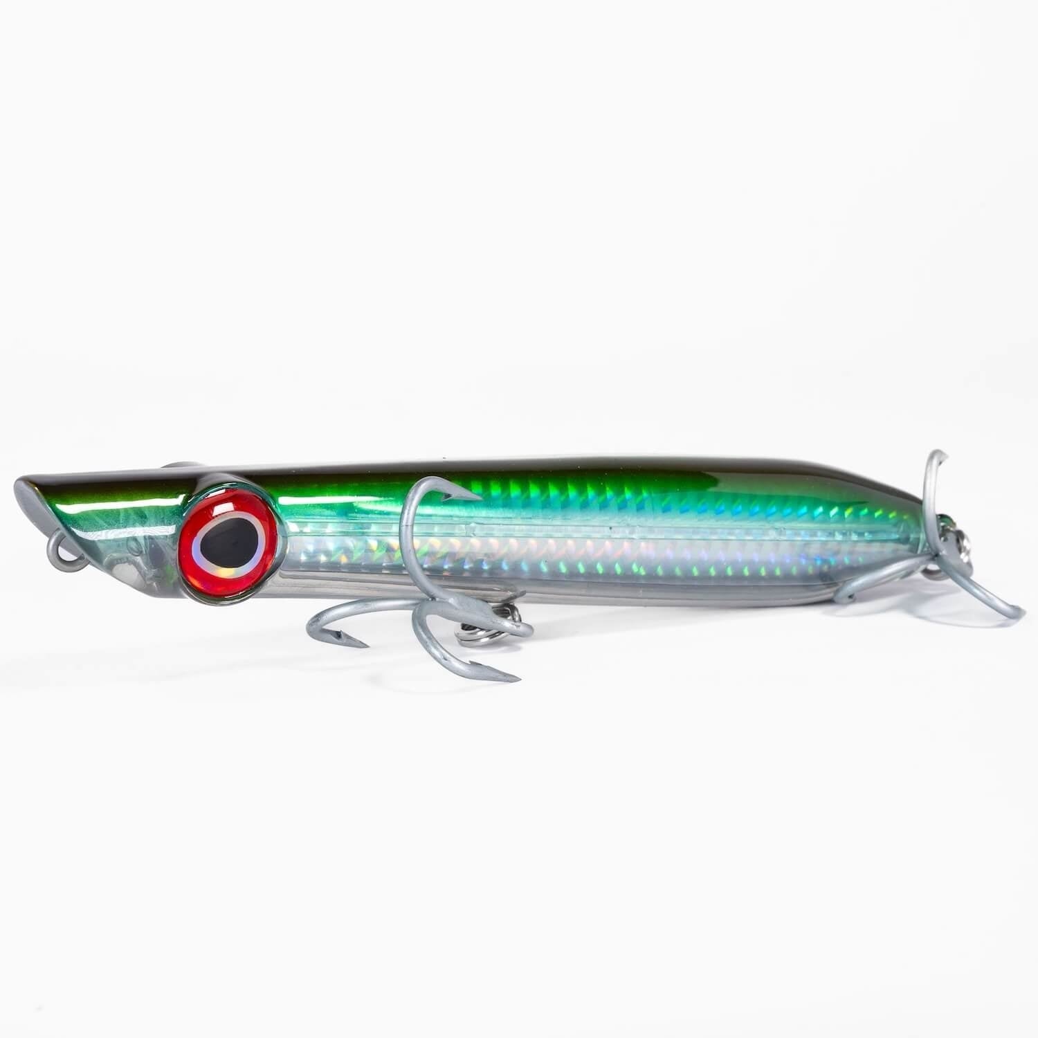 Dark Matter Pencil Poppers are going to be your favorite pencil to fish. These hard plastic lures feature thru-wire construction with internal rattles that not only make noise but act as a weight transfer system. They cut through the wind really well and have great action in the water. We have outfitted them with VMC 4X Treble Hooks and stainless steel split rings. Dark Matter Pencil Poppers come in three sizes and each size has different size hardware specific to that size.